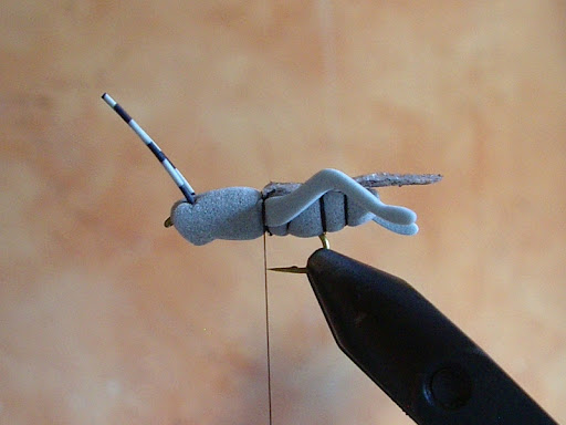 En este mismo segmento colocamos las patas traseras, al atar las patas traseras tienden a abrirse, aquí lo dejo a vuestra elección, si os gusta el saltamontes con las patas un poco abiertas no apliquéis loctite y si queréis las patas un poco mas pegadas al cuerpo gota de loctite y listo.