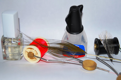 | Si vamos a montar varias ninfas, las disponemos en un trozo de foam para darlas una capa de esmalte de uñas transparente en serie. |