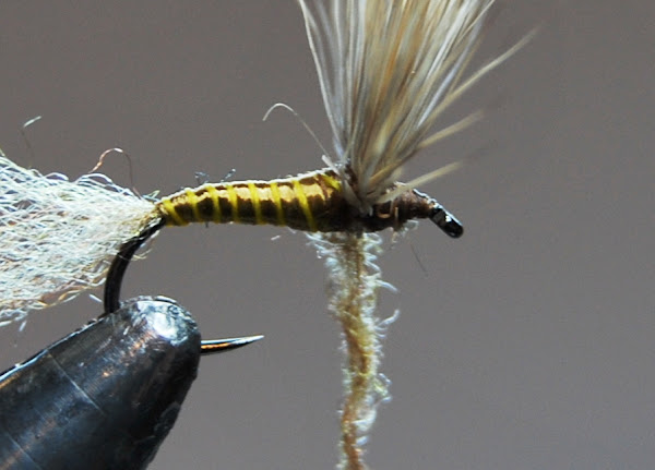 Para el cuerpo se puede utilizar cualquier tipo de material (seda, dubbin natural o artificial, quill etc. ) pudiendo poner exhuvia para realizar una emergente o cercos para un subimago, dependiendo de lo que queramos. En este caso, un pardón en emergente.