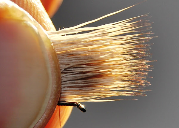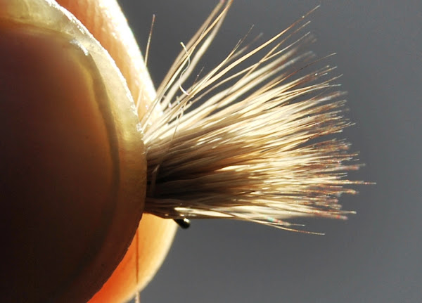 Después de cortar un mechón de pelo de ciervo, eliminar la borra e igualar las puntas (utilizando un igualador a tal efecto), lo presentamos en el anzuelo atrapando con los dedos índice y pulgar el mechón, de manera que el largo del mismo sea el largo de la tija.