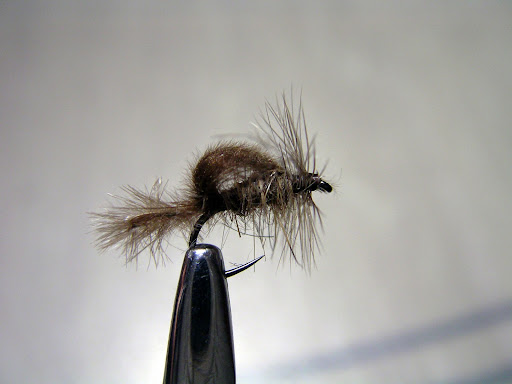 Lo que sí sé es que el modelo del que yo tuve conocimiento en su día no estaba montado con CDC, sino con pluma de gallo pardo de León. Aún así, más que los materiales concretos, lo que interesa en este caso es el patrón: una exhuvia (de seda, avestruz o lo que cada uno estime conveniente), un cuerpo en dubbing, un saco alar (en CDC, antron, pluma de León…) y dos o tres vueltas de hackle, con la posibilidad de añadir una brinca o no, siempre en anzuelos del #18 o el #20 y siempre capaz de dar peces en las más variadas circunstancias, como sucedió el año pasado en el río Caudal, en un día que tampoco era el adecuado para pescar a seca, ya que la actividad fue nula durante toda la mañana.